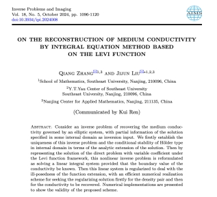 近日,Inverse Problems and Imaging(IPI)发布了2024–2025年高被引论文精选榜单。万博体育 青年教师张嫱(博士)与东南大学万博体育app 刘继军教授合作完成的研究论文:On the reconstruction of medium conductivity by integral equation method based on the Levi function 成功入选该榜单,标志着该成果在反问题与成像领域获得了广泛关注与认可。